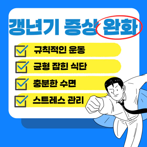 갱년기 증상을 완화하고 일상생활에 긍정적인 변화를 위해 다음과 같은 생활 습관 개선이 도움이 됩니다.
